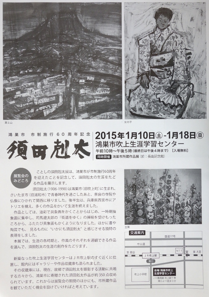 須田剋太の生地である埼玉県鴻巣市に新しい生涯学習施設がオープンし、そこに市が所蔵する須田剋太作品を収める収蔵庫や、展示室もつくられる。 毎年開催している須田剋太展が、今回は新施設のお披露目にもなる。 会場:鴻巣市吹上生涯学習センター 会期:2015.1/10(土)~1/18(日) (ここの3枚とも画像をクリックすると拡大します) |