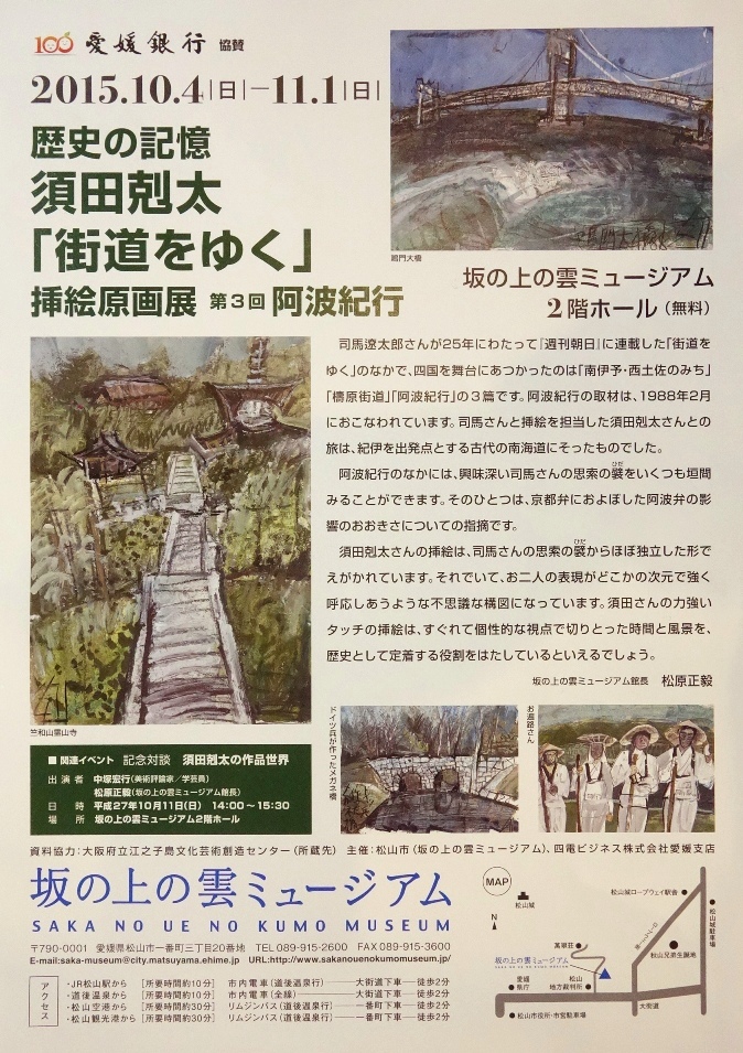 | □ 坂の上の雲ミュージアム「須田剋太「街道をゆく」挿絵原画展 第3回阿波紀行」展 (2015.10.1) 四国・松山の坂の上の雲ミュージアムでの『街道をゆく』の原画展は、これまで四国をとりあげてきて、「南伊予・西土佐のみち」「檮原街道」につづいて3回目になる。 今回は地元埼玉での須田剋太展と重なってしまって、見に行けなかった。 (画像をクリックすると拡大します) http://www.sakanouenokumomuseum.jp/ |