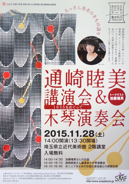 □ 「通崎睦美講演会&木琴演奏会-1935をめぐって」: 日時:2015.11/28(土) 14時開演 会場:埼玉県立近代美術館 2階講堂 主催:あなたと どこでも アート実行委員会 埼玉県立近代美術館 (画像をクリックすると拡大します) |