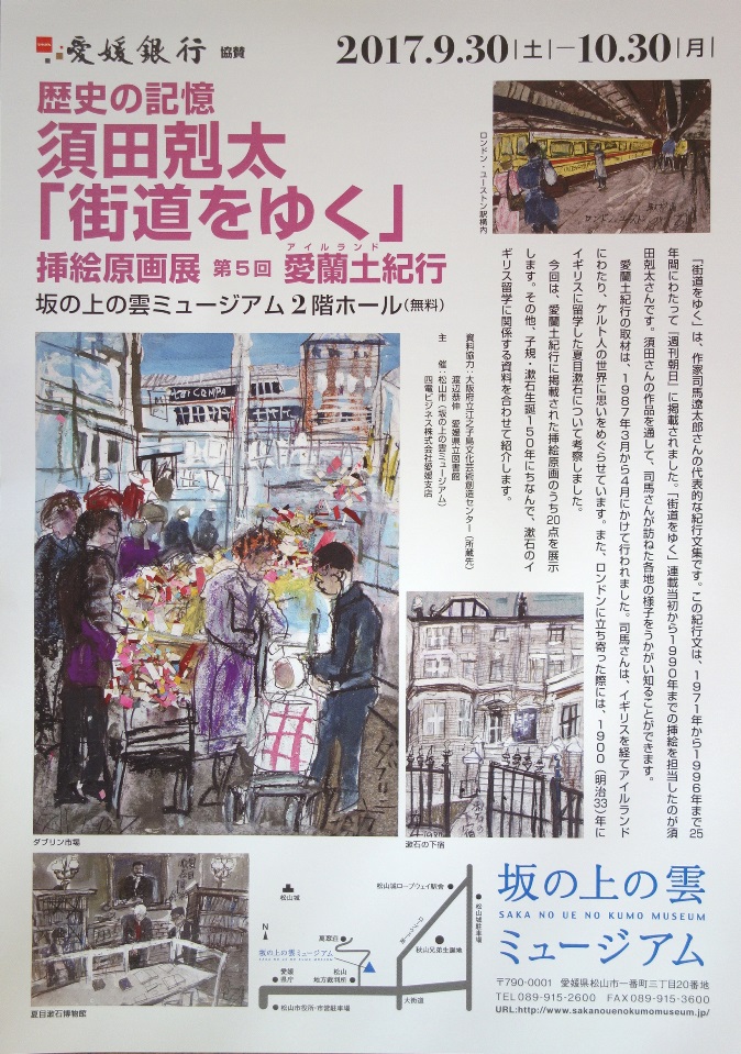 四国・松山市にある坂の上の雲ミュージアムで、『街道をゆく』挿絵原画展第5回(「愛蘭土紀行」)が開催され、今回も僕が撮った現地写真が須田剋太の挿絵と並んで展示された。 愛媛県美術館で『没後20年司馬遼太郎「21世紀"未来の街角"で」』が開催されているのにあわせて、秋10月の松山に行った。 →[ 坂の上の雲ミュージアム『街道をゆく』挿絵原画展 2016.2017] (画像をクリックすると拡大します) |